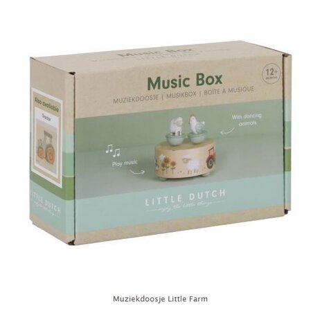 Kijk de kip en het schaap toch eens dansen op de vrolijke muziek! Deze ronde muziekdoos is versierd met een vrolijke scène van het geliefde thema Little Farm. Draai voorzichtig aan de onderkant en zet de magische dans in gang. Terwijl de melodie begint te spelen, dansen het schaap en de kip sierlijk op de bekende tonen van "Old MacDonald Had a Farm". Een prachtig cadeau dat een glimlach op het gezicht van jouw kleintje zal toveren zodra de muzikale reis van de Little Farm begint te spelen.